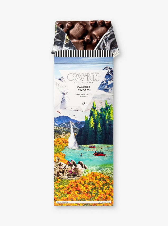 Compartés Campfire S'mores dark chocolate bar is s'mores taken up a notch. We make marshmallows and blend them into our rich signature dark chocolate with bits of graham crackers for a familiar, yet distinctive, flavor sensation. What can be better than chocolate s'mores in chocolate bar form? Featuring a gorgeous design made from over 40 photos that even feature our chocolatier Jonathan Grahm's dogs Samson, Rocco, Grayson, and Sebastian hidden on the back... This bar evokes summertime, campfires, and warmth, and will quickly become a new addition to your summer celebrations.