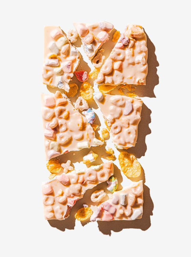 Compartés Cereal Bowl gourmet white chocolate bar is a cereal lover's dream. Creamy Compartés white chocolate overflowing with crunchy cereal and sweet marshmallows. It's one of our most popular white chocolate bars...there's absolutely nothing else quite like it! Handmade in our Los Angeles Kitchen.