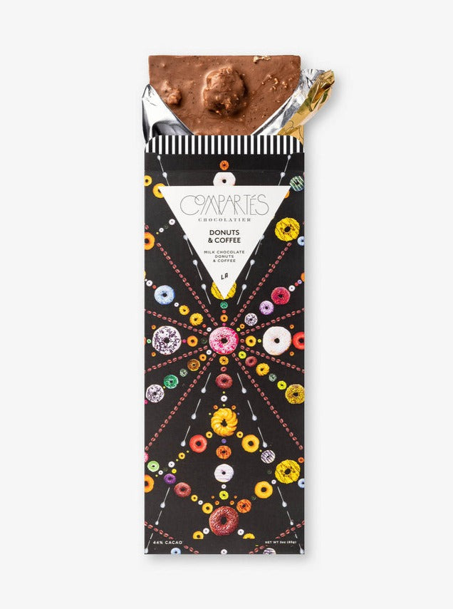 Compartes best-selling milk chocolate, Donuts & Coffee chocolate bar features donuts from the best Los Angeles donut shops. We break the donuts up and mix them into the most creamy delicious milk chocolate you will ever taste. Add in coffee grounds from some of LA's best coffee shops and you've got yourself a winner! Donuts & Coffee chocolate bar features a geometric stylish pattern made from donuts and coffee on the custom box of our gourmet and delicious chocolate bar! Handmade in our Los Angeles chocolate kitchens.