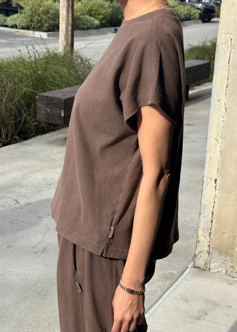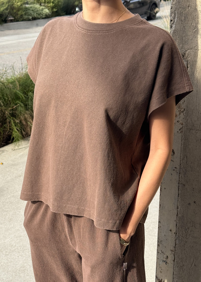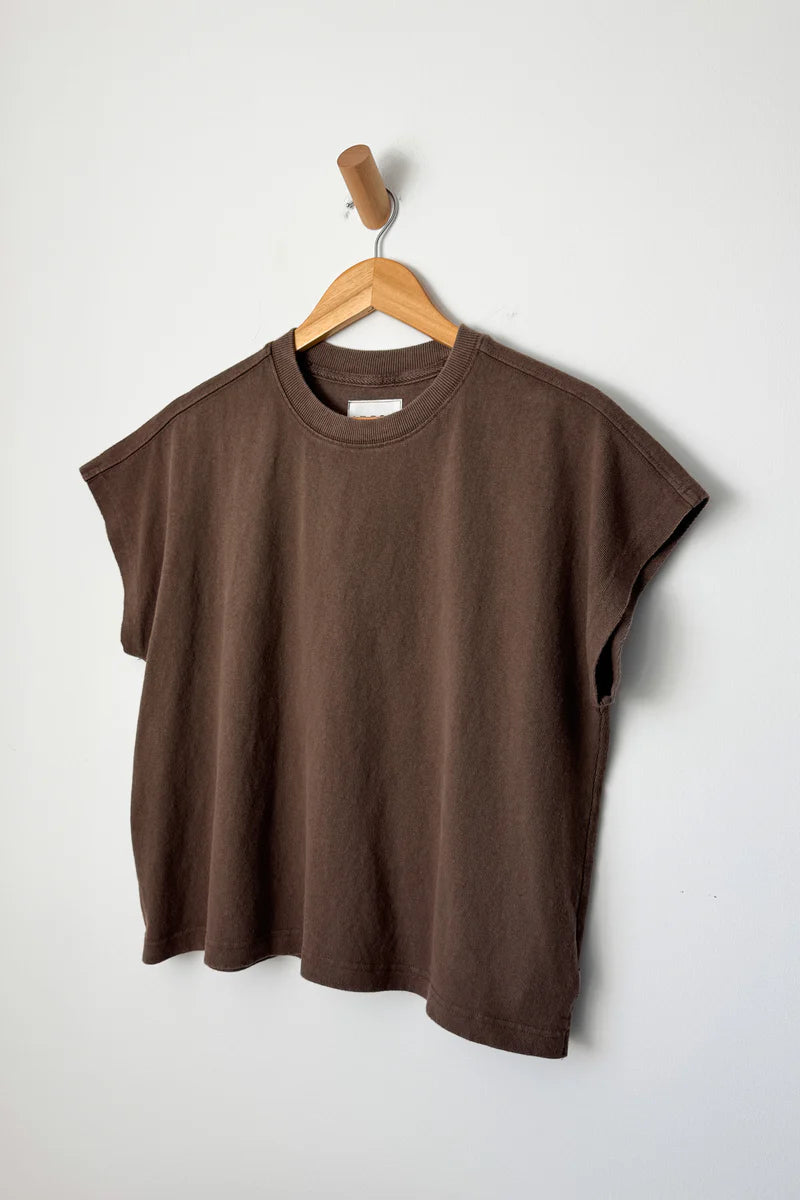 Jeanne Tee is our perfect muscle tee. She features a shorter length to pair perfectly with high waisted bottoms but still give enough coverage for mid-rise bottoms and just the right amount of off shoulder dolman sleeve. She has a high crew neck with an extra wide neckband that adds to her signature charm.