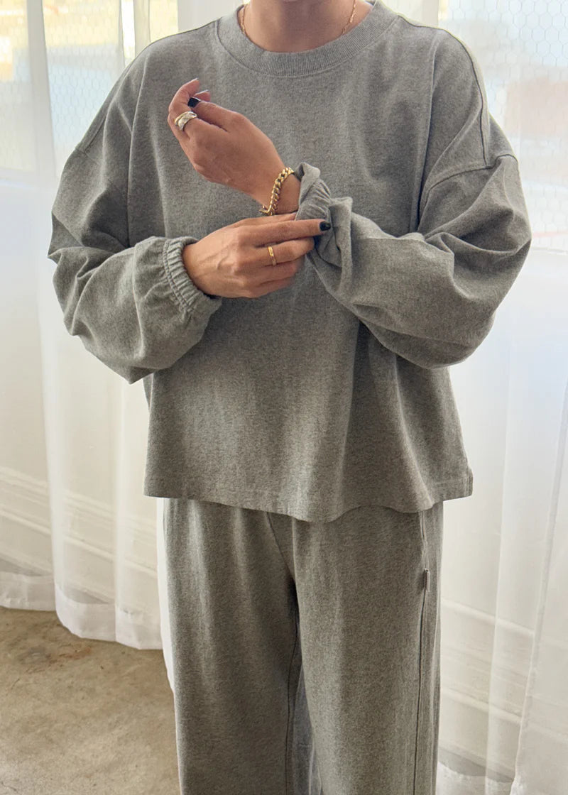 We dreamed this beauty up while searching high and low for a simple long sleeve with a feminine touch. This essential long sleeve tee is made in a gorgeous 100% heavyweight cotton fabric. Super raw textured yet soft and airy! Elastic ruched sleeve opening creates a slight balloon sleeve effect worn down and scrunches up beautifully. This tee is garment dyed and pre-washed for a rich textured look.