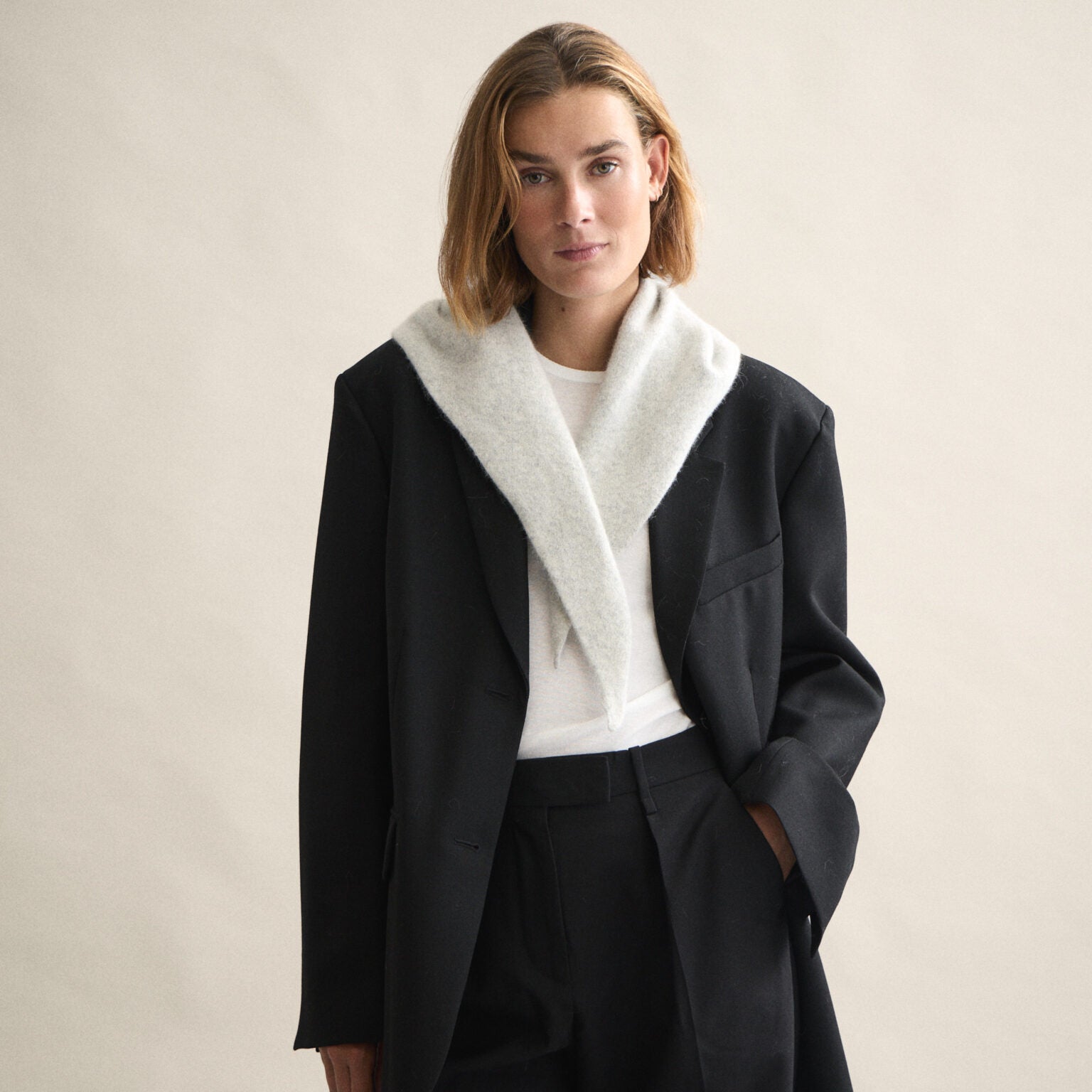 Soft, airy, and versatile — the Le Bonnet Bandana in Silver is crafted in Scotland from a fine lambswool blend. The pale grey tone adds quiet polish and subtle contrast to everyday layers. A refined alternative to a scarf, perfect for all-season wear.