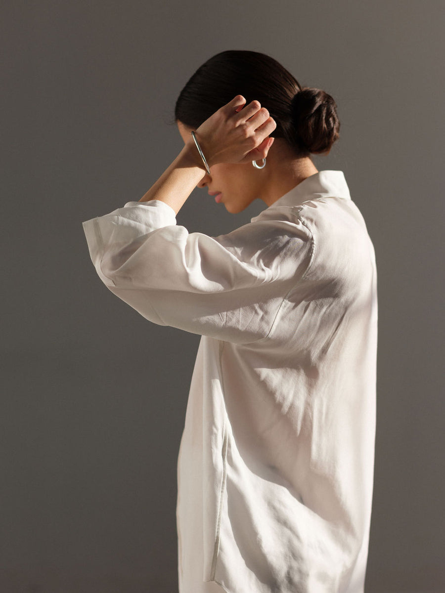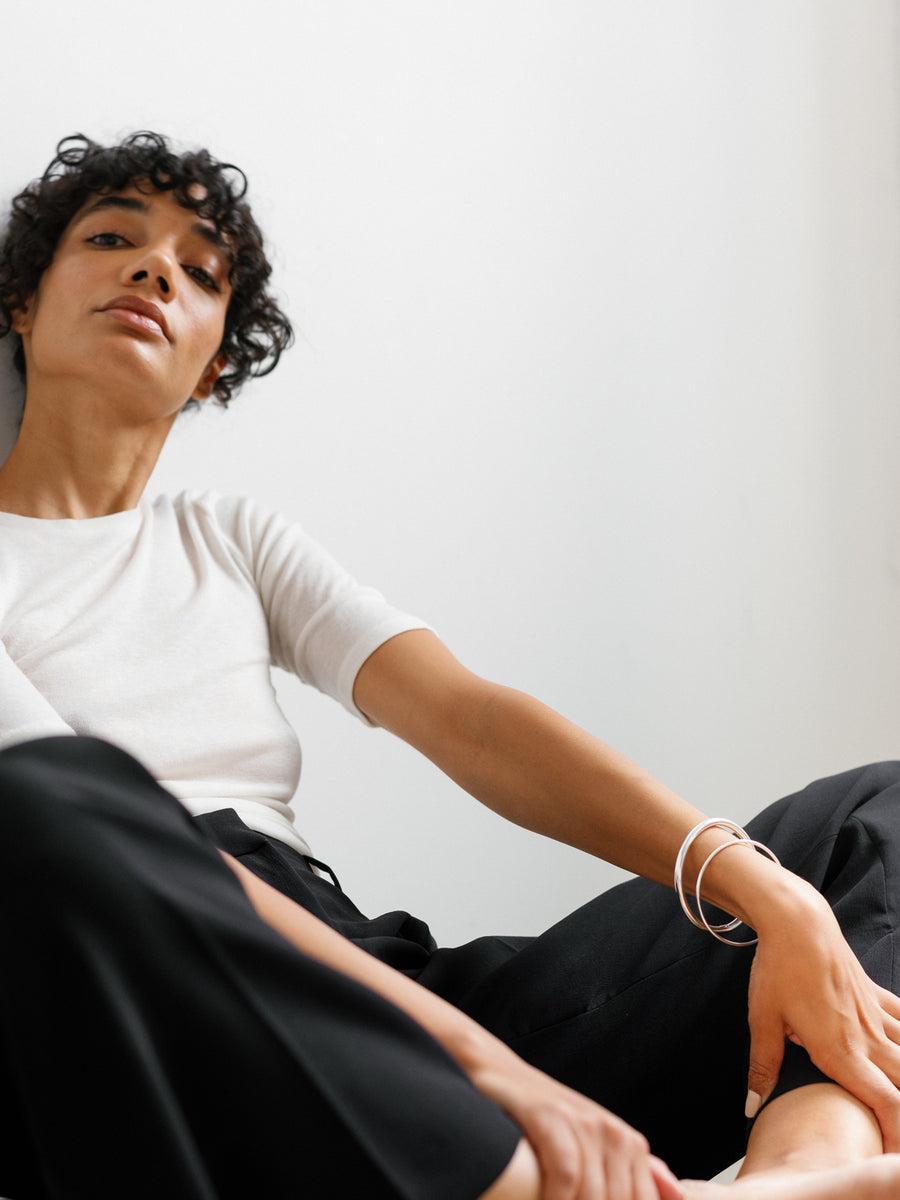 Introducing Ophelia; a timeless bangle with a minimal, modern silhouette made of Sterling silver with a fine Silver finish. It's moderate width is enough for it to be wore alone for a minimal statement but also makes a great layering piece with other bracelets, your everyday watch and more.