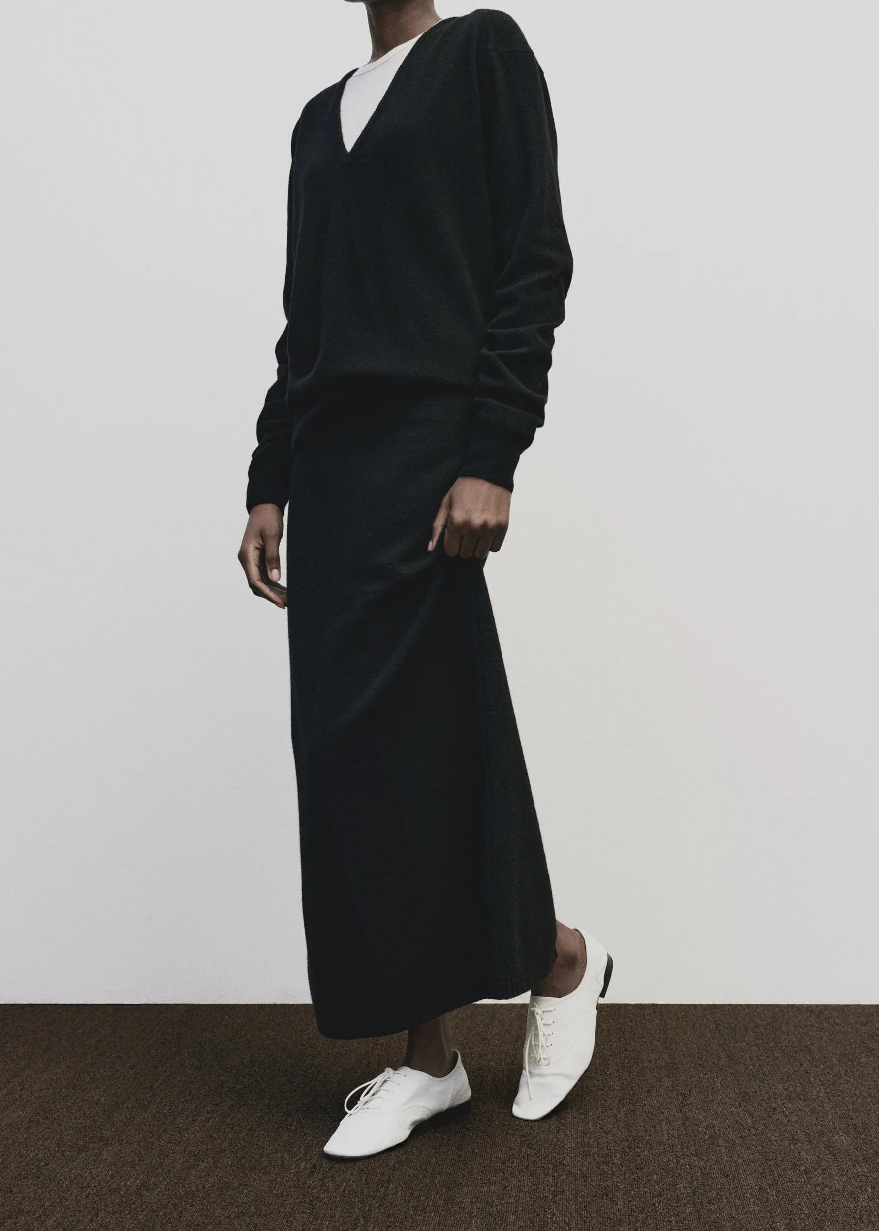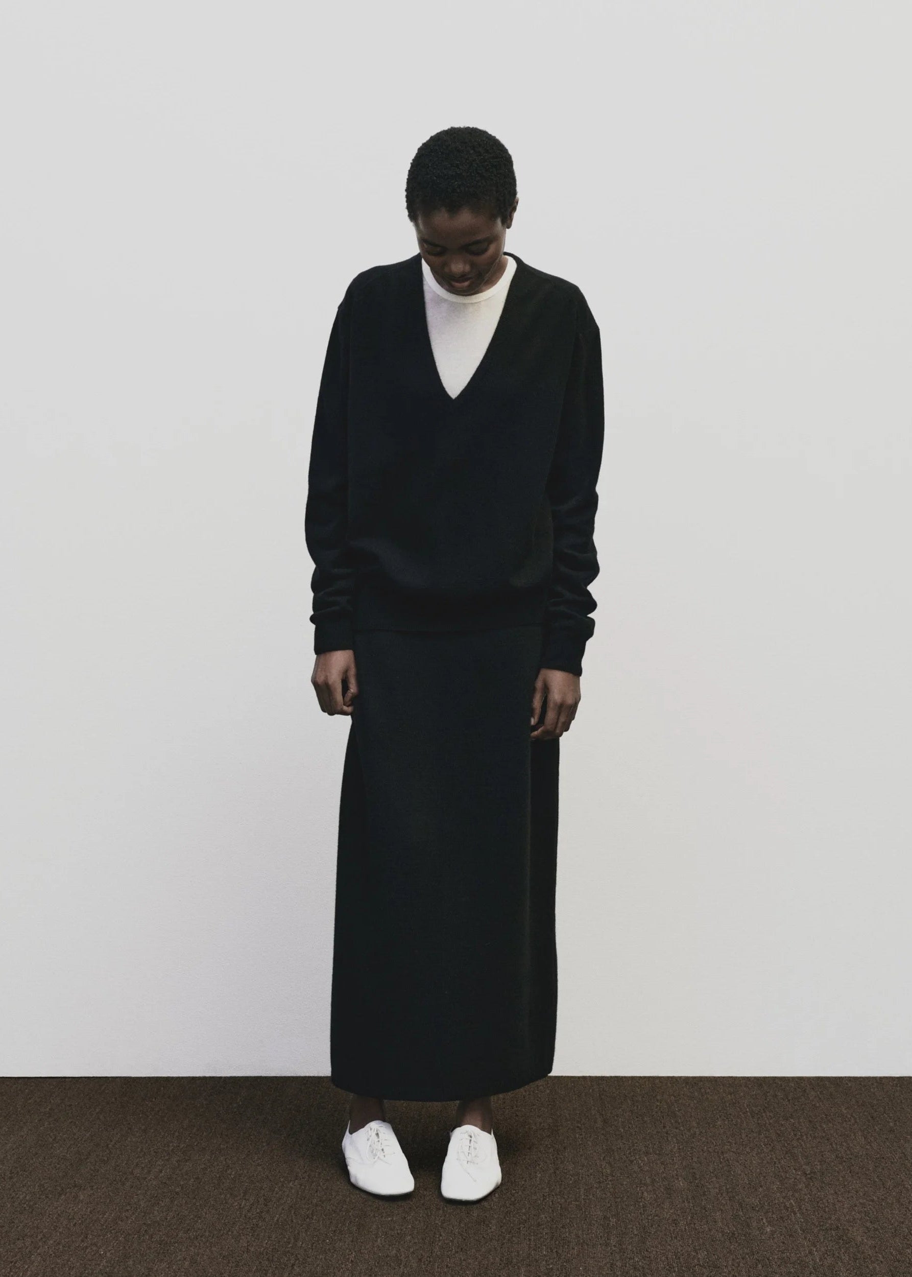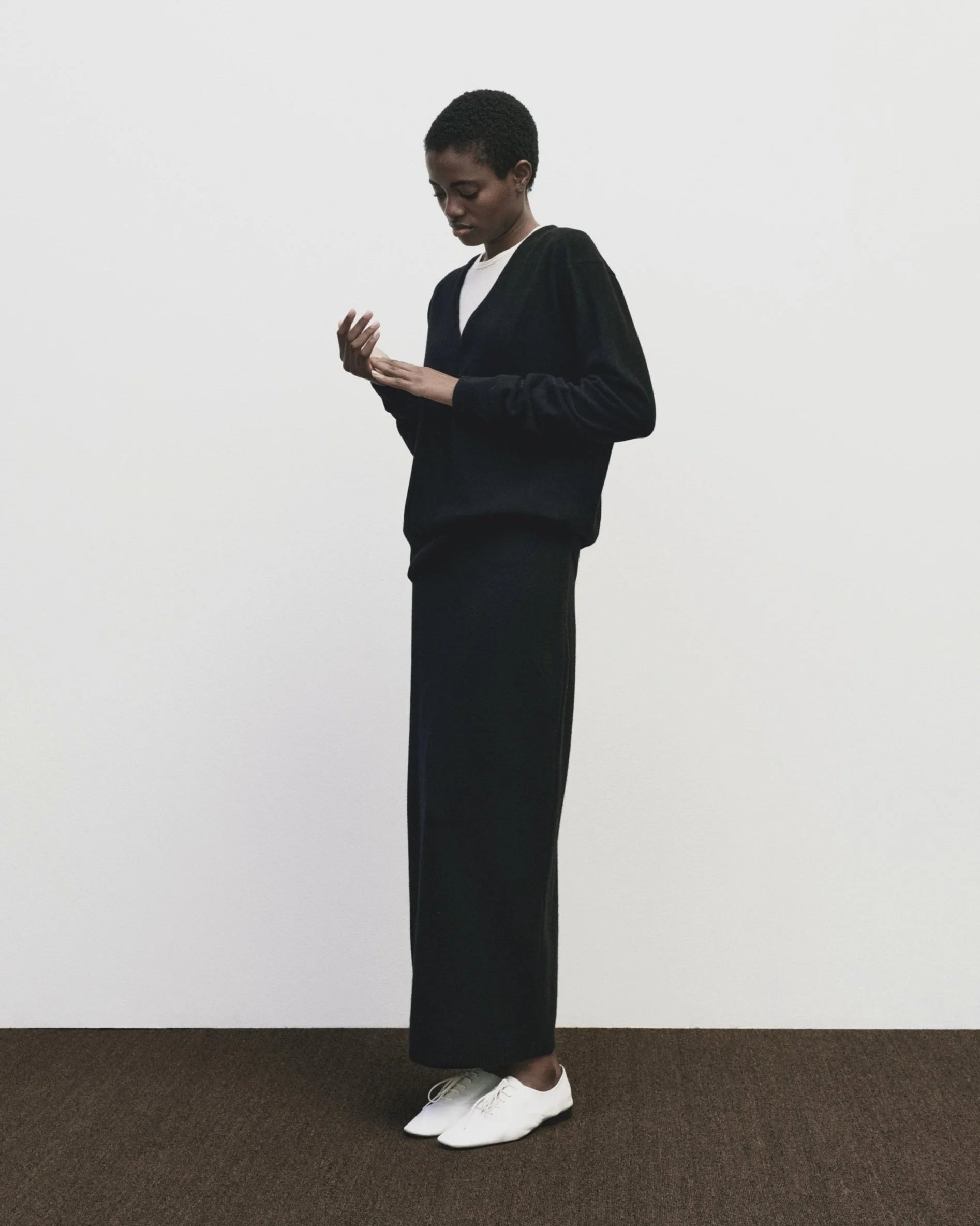A clean, elegant silhouette with quiet strength. This midi knit skirt flows with a straight cut, anchored by a soft blend of merino wool and cashmere that molds to the body. The rich black tone makes it versatile enough for tonal layering or contrast with lighter neutrals. The elastic waistband and back slit keep it as comfortable as it is polished.