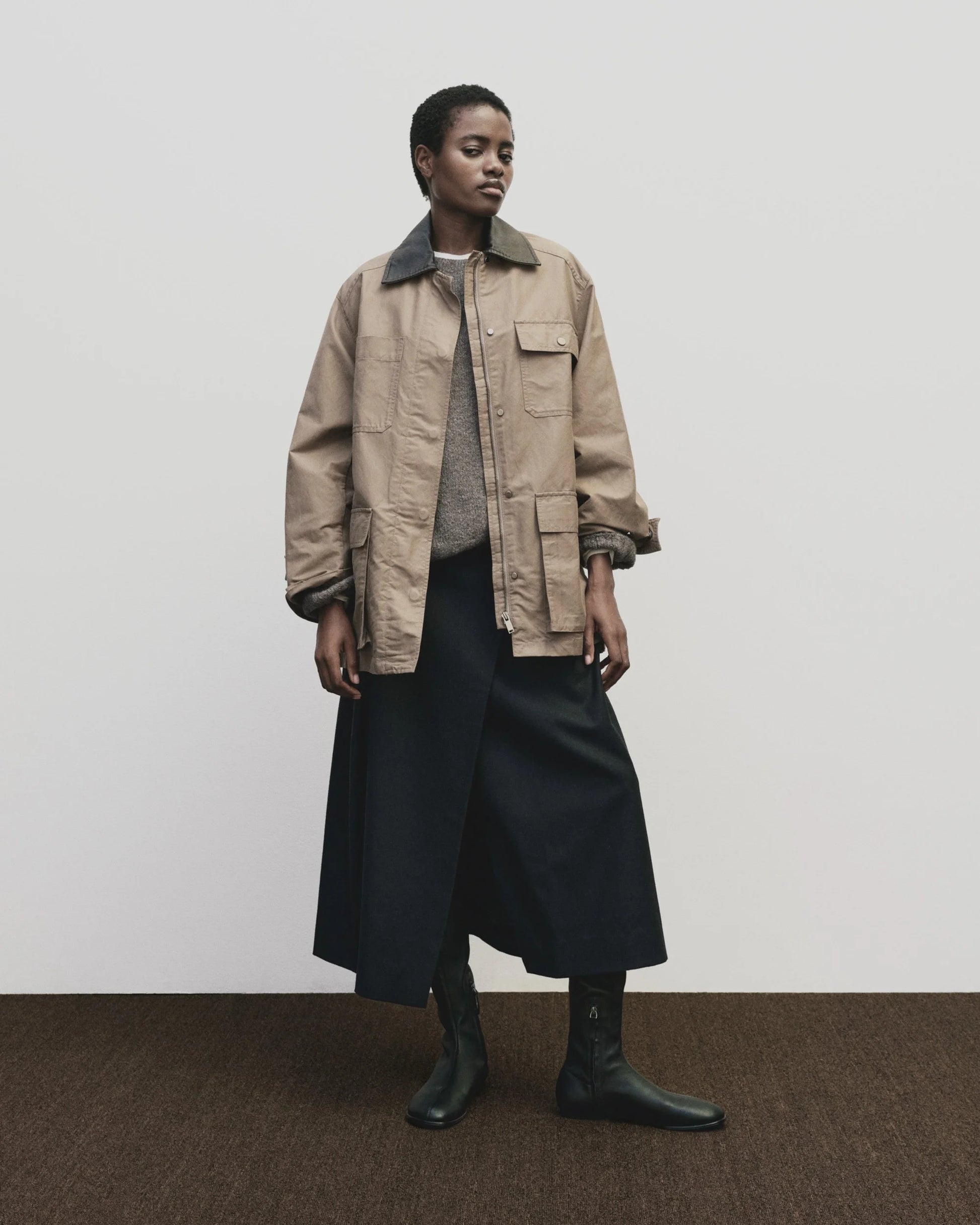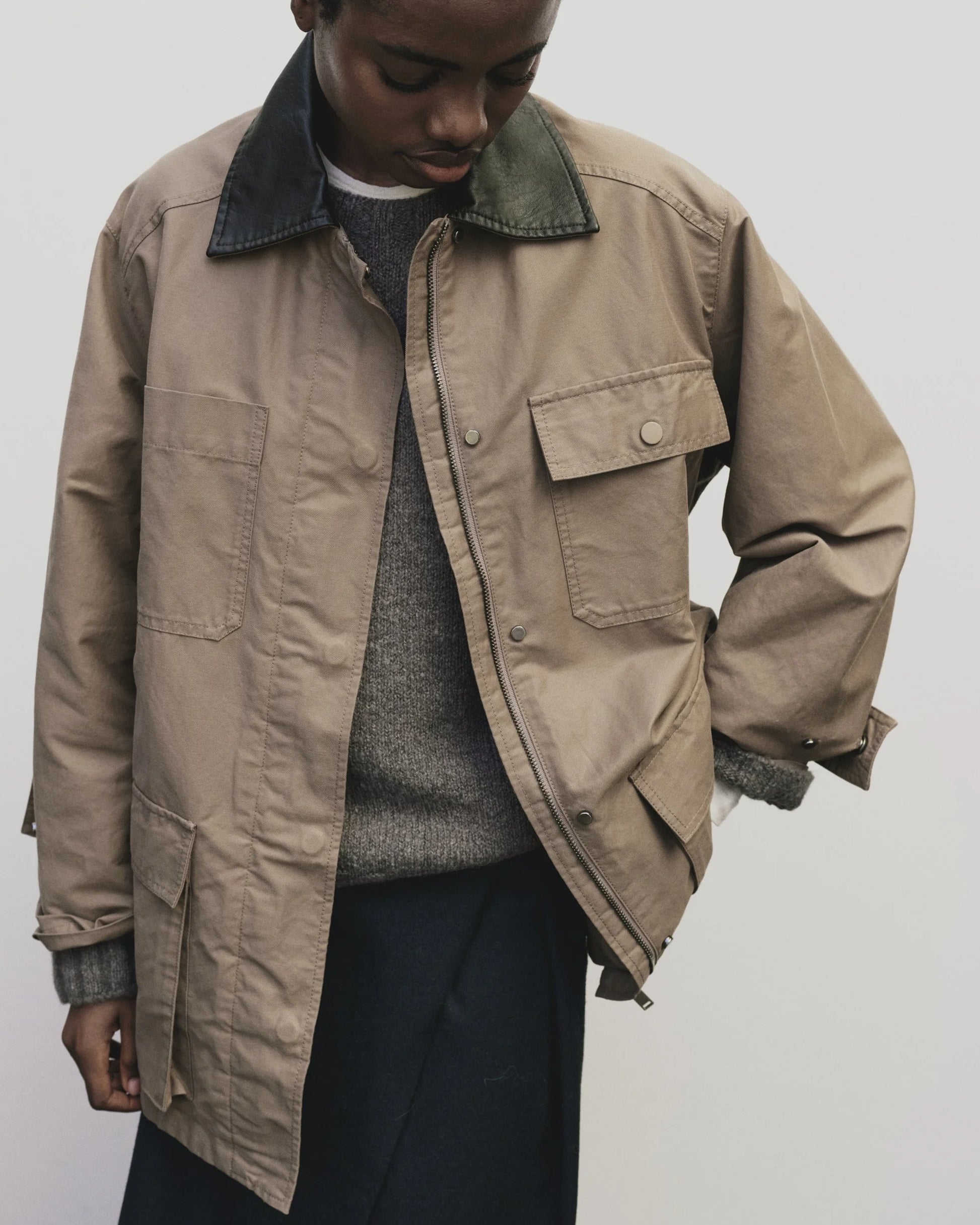 A soft nod to classic workwear, reimagined with Mijeong Park’s refined ease. This clean, modern take on the work jacket features a contrast collar that adds subtle edge, while the relaxed silhouette keeps it easy and understated. The dark beige tone brings warmth and depth — neutral enough for every day, yet refined enough to dress up. Perfect layered over denim, trousers, or a fine knit.