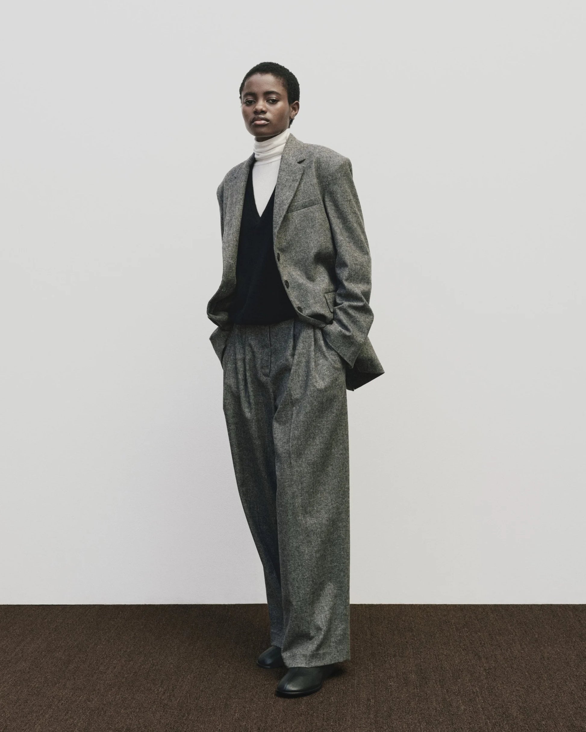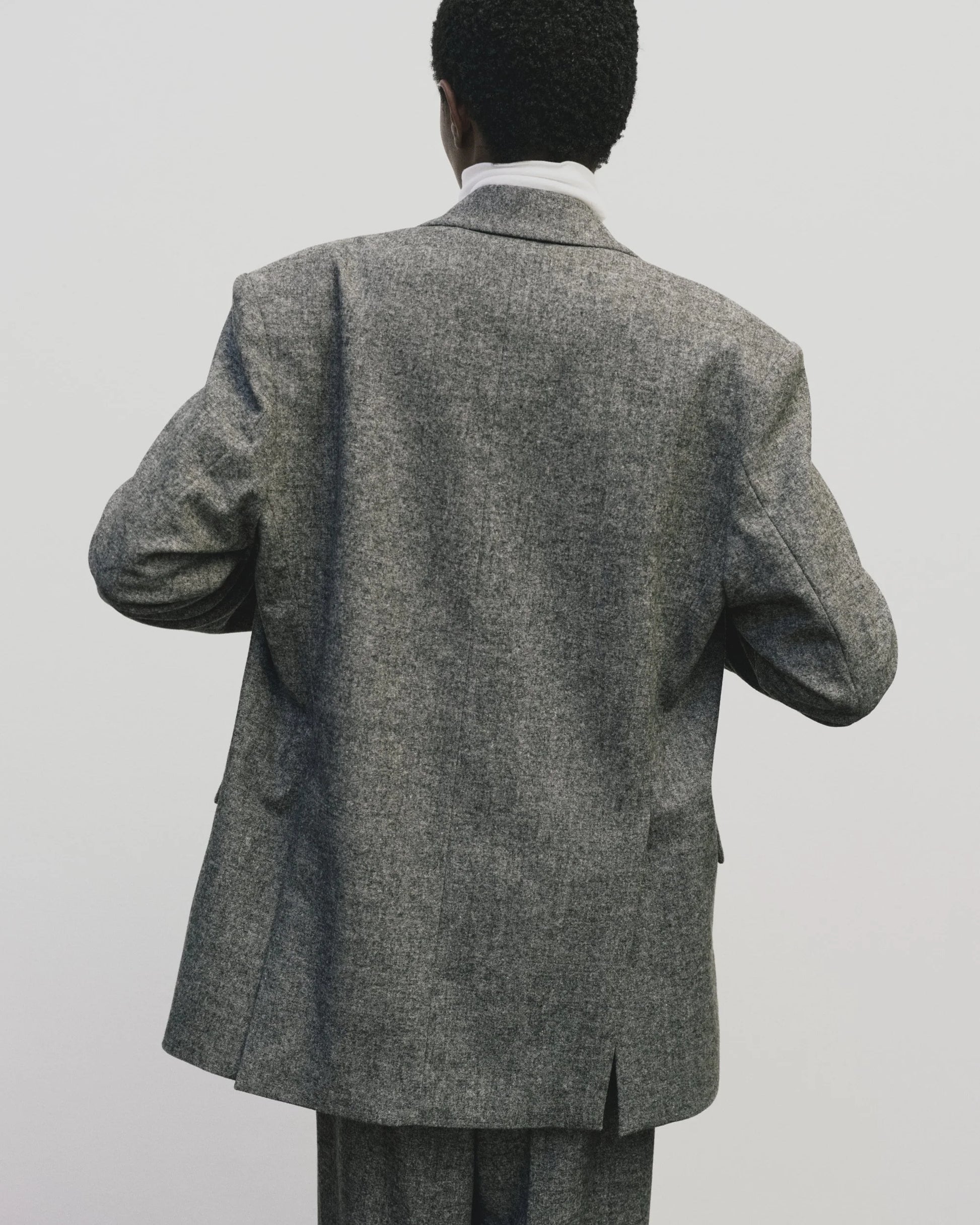 A refined approach to oversize. This wool-blend jacket offers bold structure softened by clean lines and dropped shoulders. The gray hue feels modern and versatile, grounding both denim and suiting alike. A notched collar and double back vent add subtle tailoring detail, while roomy proportions give it ease across seasons.