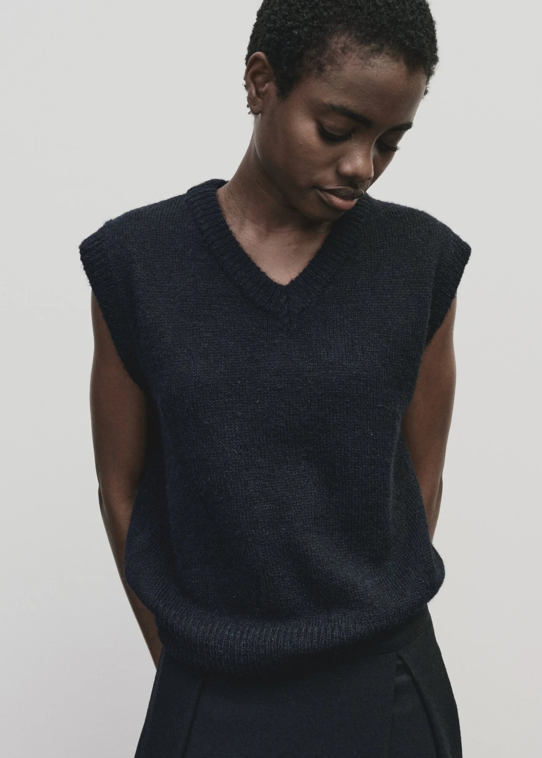 A modern essential with quiet refinement. This V-neck vest is softly structured with a relaxed silhouette that layers effortlessly over shirting or fine knits. The deep navy tone adds a subtle richness — a clean alternative to black that feels both classic and new. The ribbed trim and smooth finish keep it minimal and versatile, ideal through changing seasons.