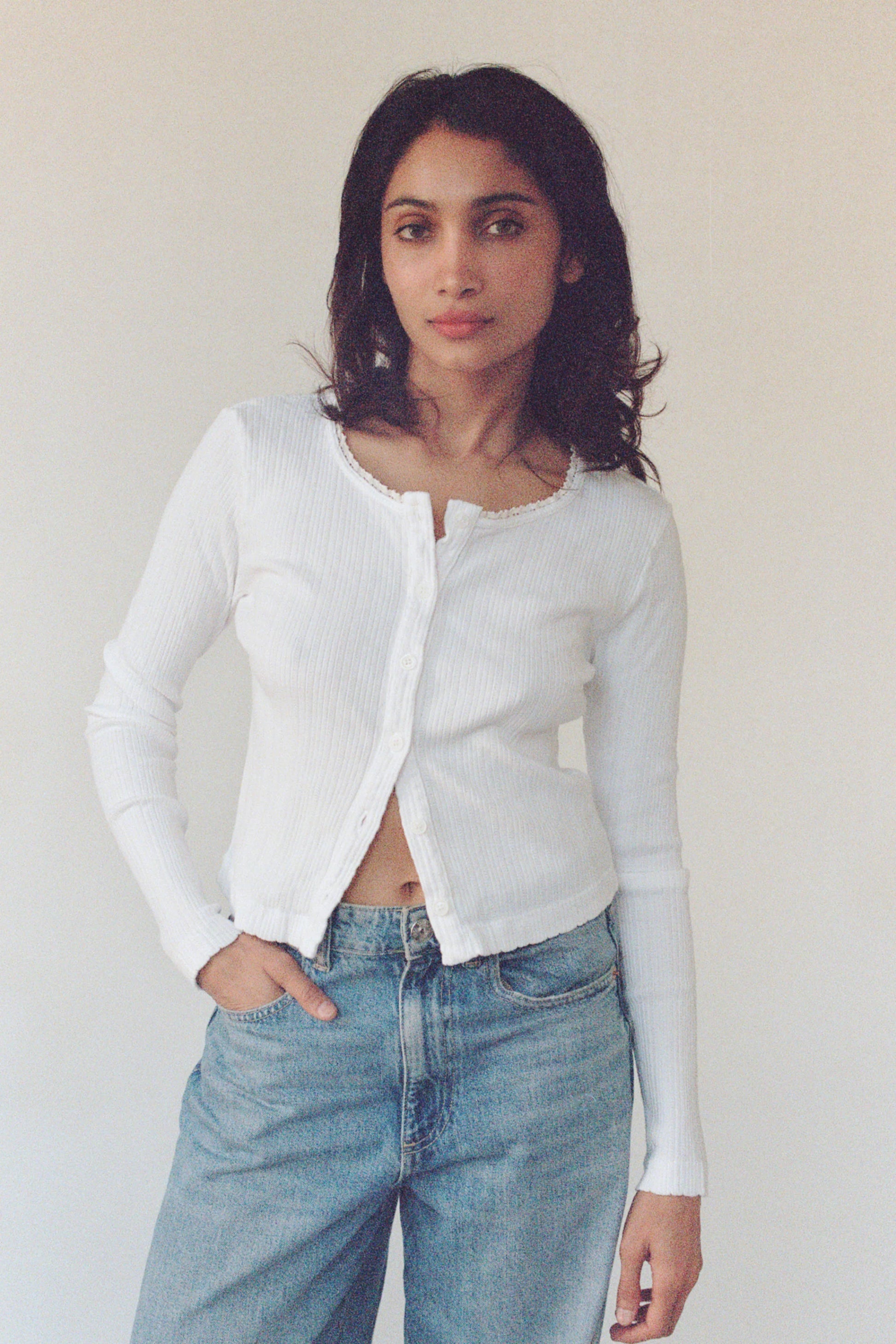 With a slightly cropped fit and bracelet-length sleeves, it’s flattering on its own or layered over a tank or tee. Garment washed for softness and to remove shrinkage, it has a comfortable, lived-in feel from the very first wear. Feminine, thoughtful, and quietly special, it’s the kind of piece that adds softness to everyday dressing.