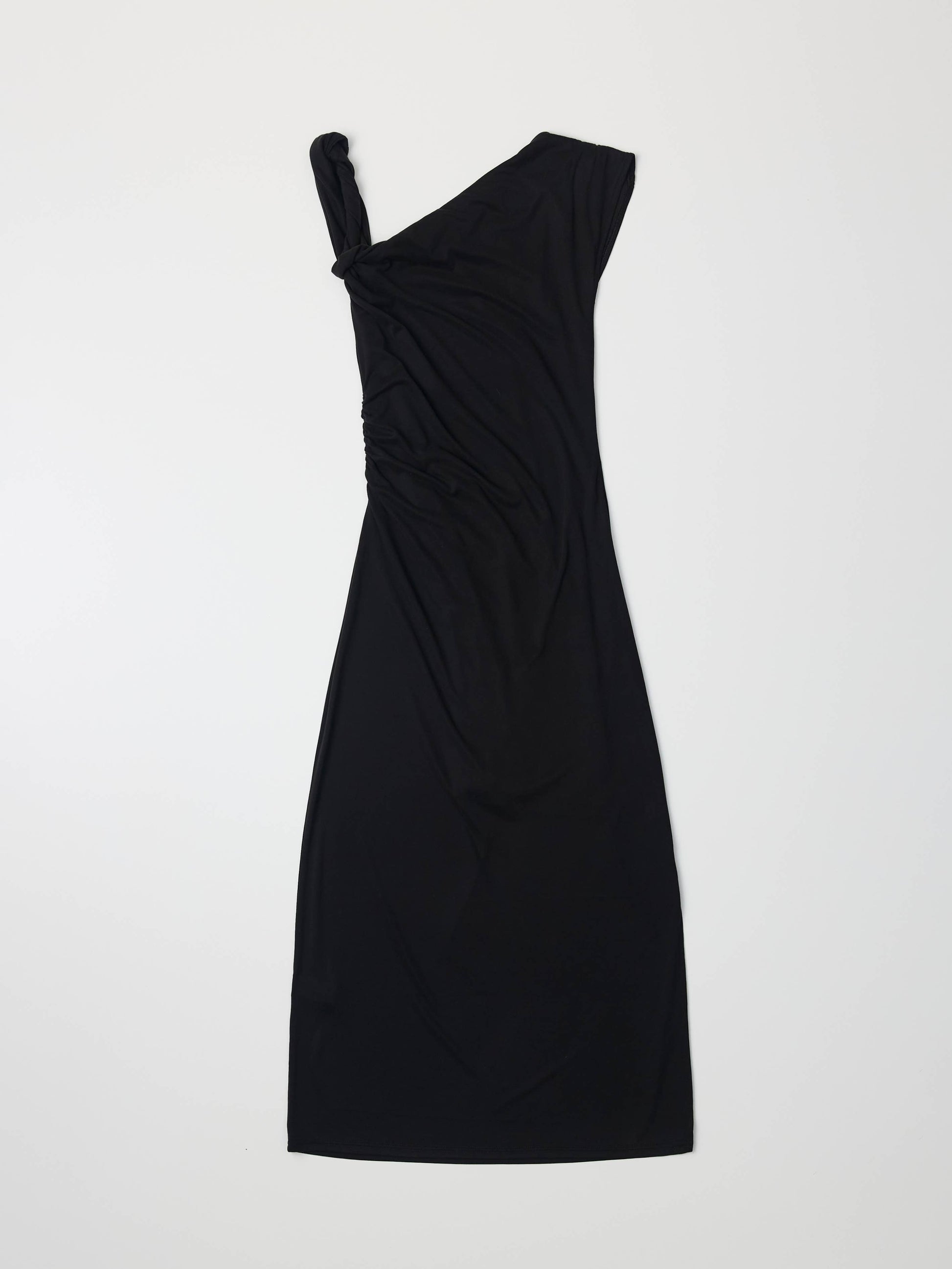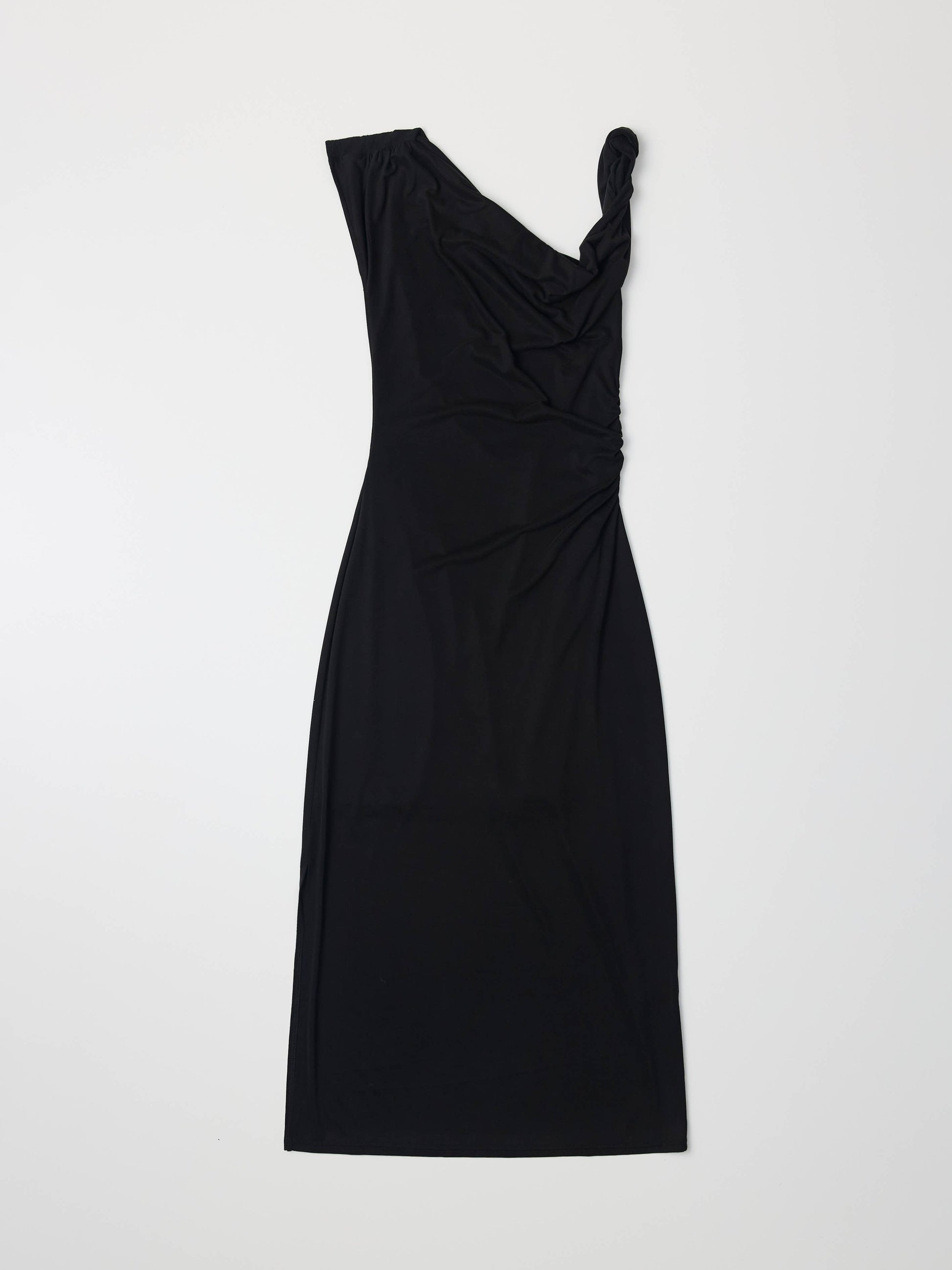 The Itria Dress is a fitted maxi dress featuring a twisted shoulder strap, asymmetrical neckline, and a shirred waistline for added shape. Its sleek design offers a modern, flattering silhouette perfect for both casual and dressy occasions.