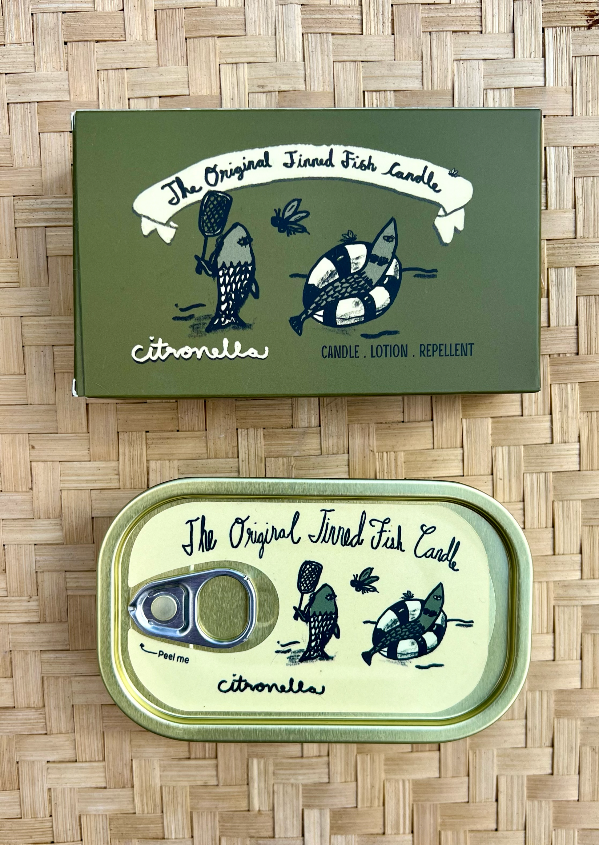 Infused with the refreshing scent of citronella, it effectively keeps pesky bugs at bay while creating a pleasant ambiance. Packaged in a charming tinned fish container, it adds a whimsical touch to any setting, indoors or out.