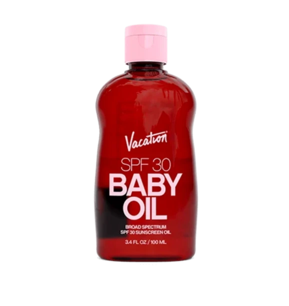 Vacation SPF 30 Baby Oil is a fun, broad spectrum sunscreen oil that reimagines a familiar family favorite for safe use in the sun with high-performing SPF30 actives, a classic nostalgic scent, and naturally derived oils that deliver an iconic, enviable shine.