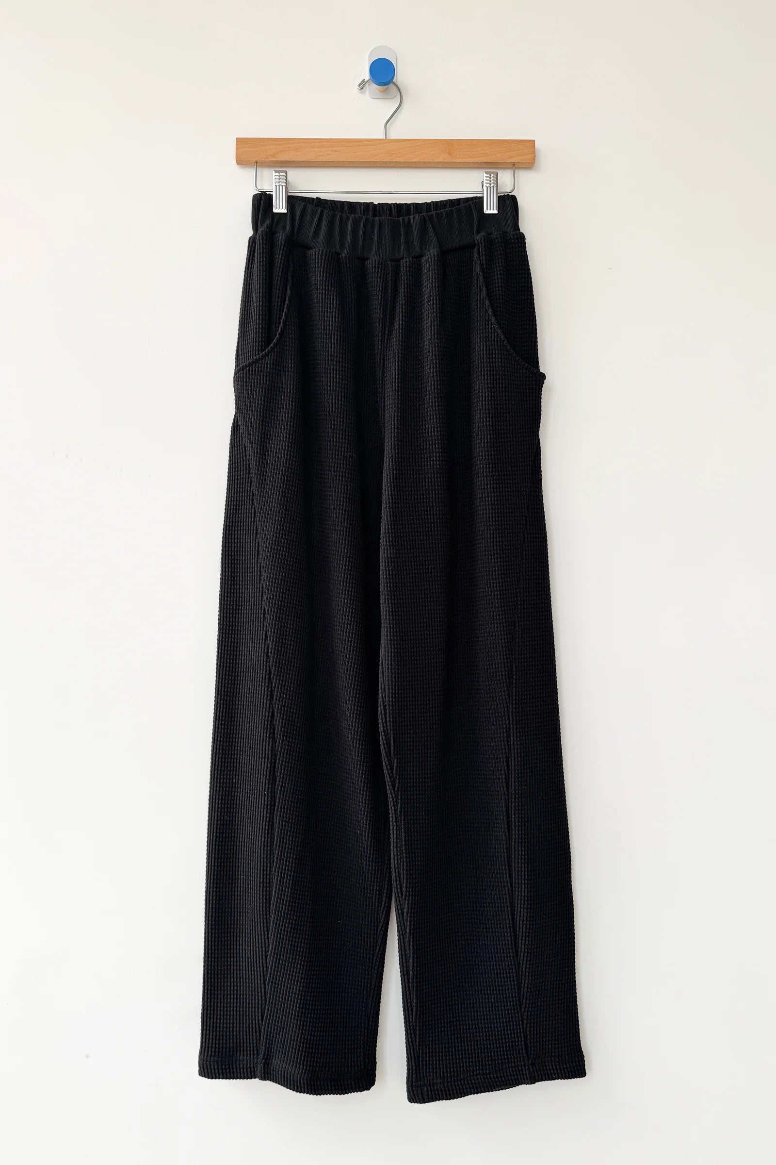A relaxed waffle-knit pant designed for everyday ease with a soft, textured hand and breathable, year-round comfort. Made from a cotton blend with subtle stretch, the Waffle Lo Pants sit high at the waist with a relaxed leg that drapes effortlessly. The elasticated waistband keeps the fit easy and flexible, while the True Black colourway offers a quietly essential staple that pairs just as well with casual layers as it does with elevated knitwear.