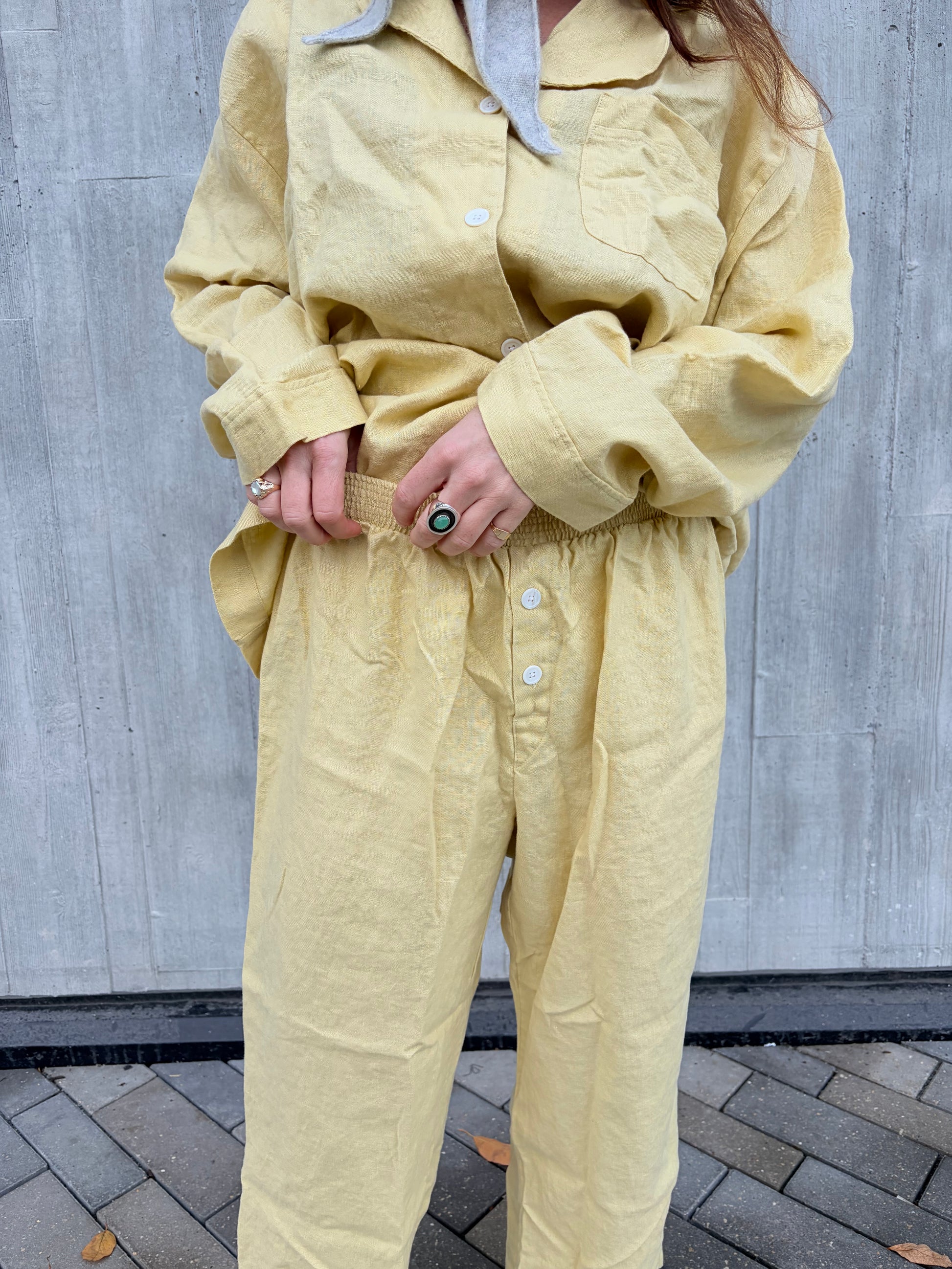 From Shelter’s commitment to artisan-driven, slow-fashion roots comes this Linen PJ Set in Limoncello — a soft, sunlit lemon hue that brightens everyday routines while staying minimal and elegant. Every detail is considered: pre-washed linen for subtle texture and easy wear, a loose button-down top for effortless layering, and straight-leg pants with an adjustable waist for comfort and versatility. Designed and made in small runs, this set speaks to Shelter’s ethos of intentional, thoughtful clothing built to age gracefully over time. Light, breathable, and easy to style — whether you’re cozying up inside or layering with outerwear.