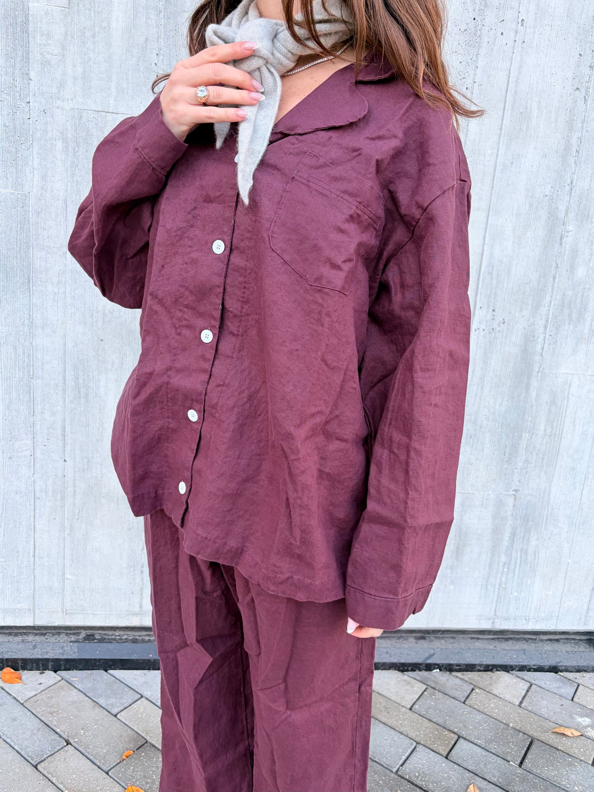 Shelter Clothing designs every piece with slow-fashion values at heart — natural fibres, simple silhouettes, and small-batch production. This Linen PJ Set in the deep Shiraz tone is no exception. Cut and sewn in small runs with washed linen, this set captures the quiet luxury of understated comfort and intention. The button-front top drapes loosely over the body, while the straight-leg pant offers a relaxed, soft fit with an adjustable waist — ideal for sleeping, lounging, or layering over knits. Shiraz adds a rich plum-red hue that feels timeless and refined. Breathable, naturally temperature-regulating linen gives this set a tactile softness that only improves over time.